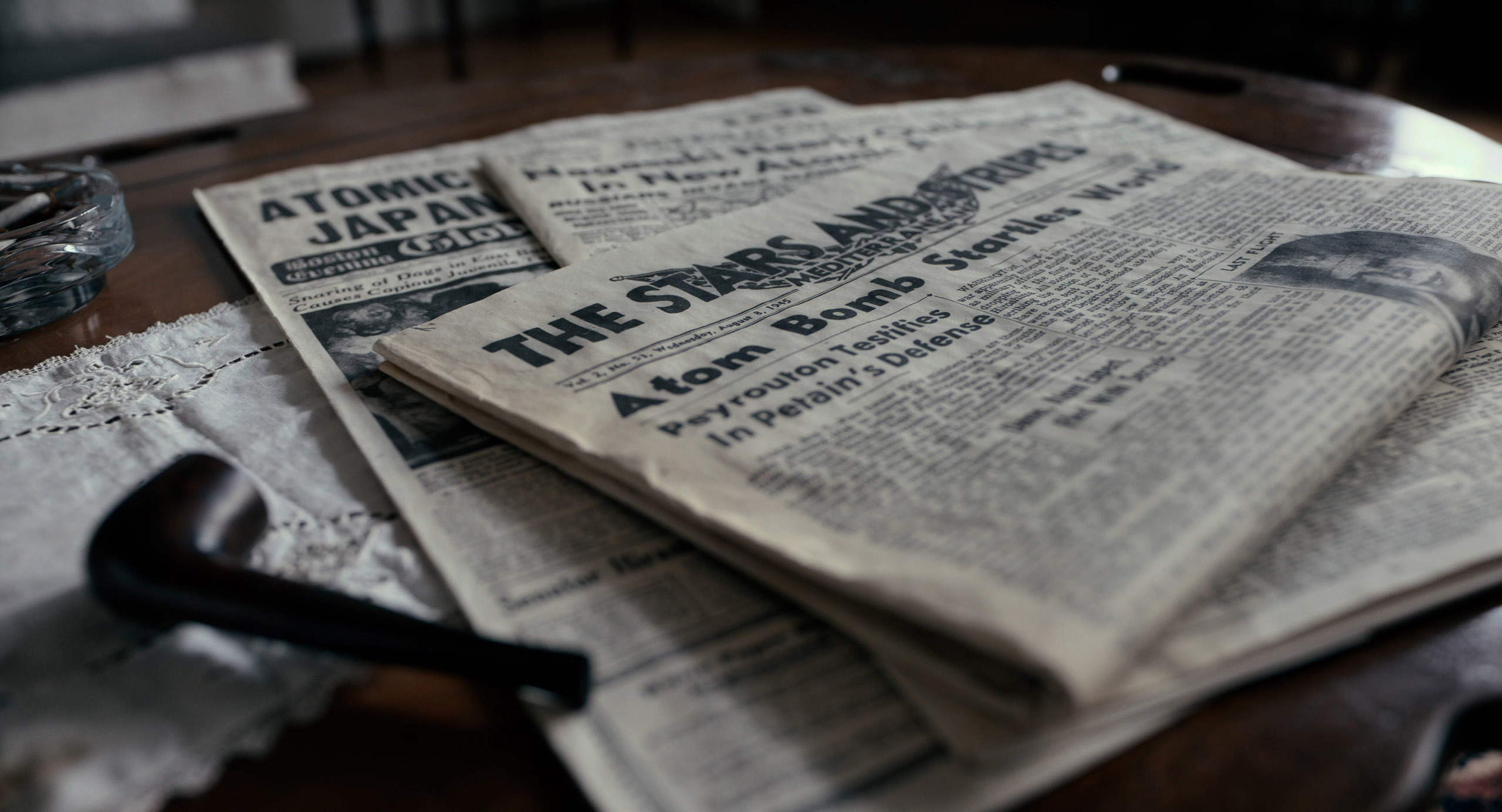 To breathe life into wartime newsreels through light, I proposed filming them live-projected in a vintage cinema, the way Americans in the 1930s and 40s would’ve encountered them, allowing archival sequences to be entered as scenes. The dust motes in the projector beam echo later graphic animations as the film traces the birth of quantum physics.