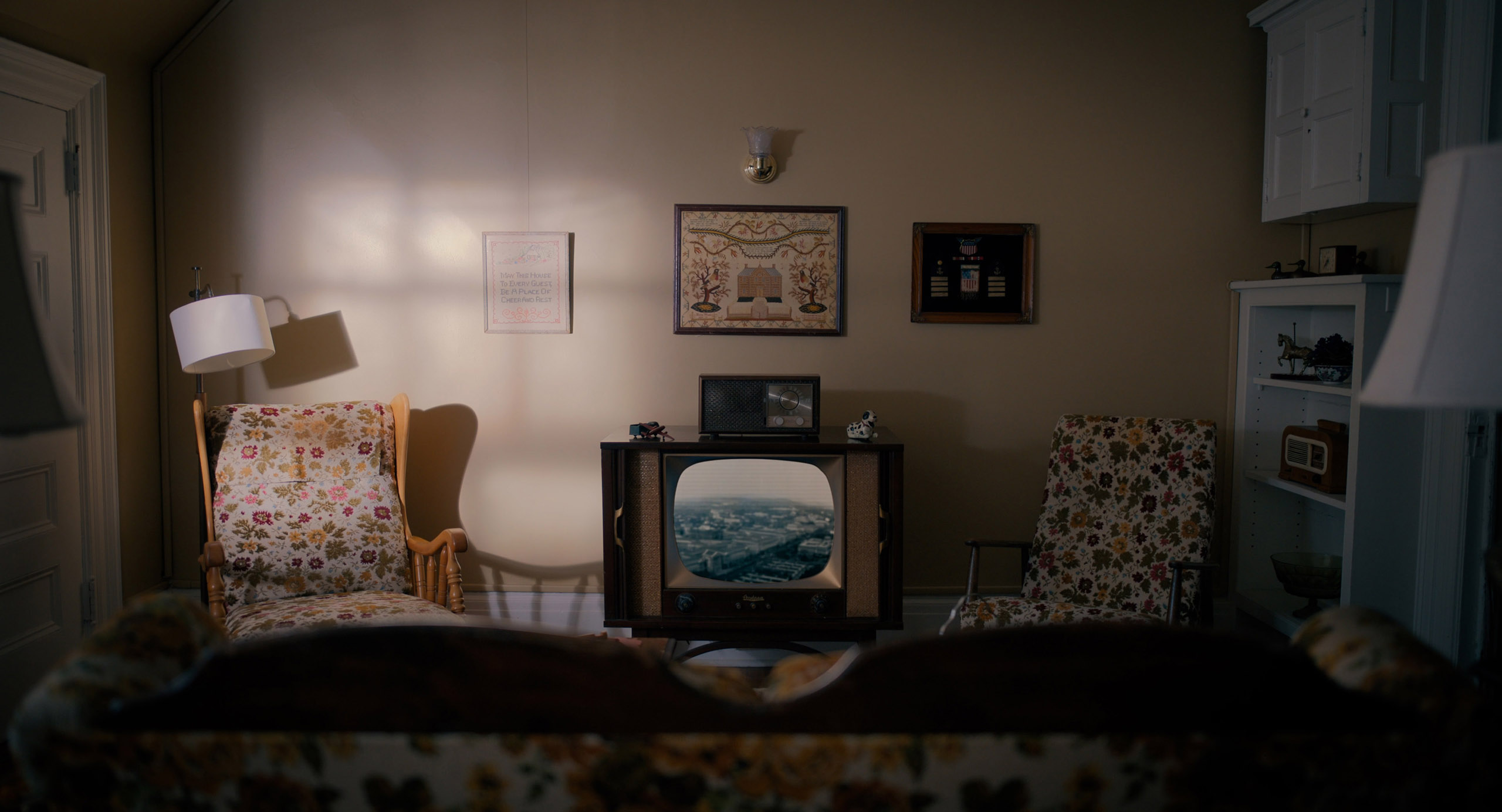 Postwar footage is shown on vintage television sets in period living rooms. Newspaper headlines are seen in physical spaces. Still photographs are treated as carousel slides rather than straight inserts. In each case, the goal is tactility and presence, in step with the film’s other elements.